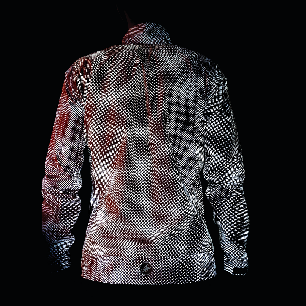 This is the Castelli of commute jackets, made to deliver maximum function on the bike and then look great when you get to work. We wanted a jacket that provides maximum visibility during those night commutes but doesn't look ridiculous with all kinds of silver reflective bands and strips when you get to the office. We applied a nearly unnoticeable reflective print on the entire surface of the jacket. You don't really see it when you're riding in the daytime or wearing the jacket off the bike, but at night the jacket reflects a distinctive pattern to get you noticed. We didn't stop at the reflectivity. The 20,000 mm water column means no water is coming through, ever. And the 20,000 MVTR breathability means that a good amount of moisture will escape. But it's the ventilation details that make this jacket stand out: there's a gaiter at the waist that you can close to seal out the wind or leave open to let some air come in from the bottom to keep you cooler. This inner gaiter allows us to make a jacket that hangs straight at the bottom — a much cleaner and more refined look than a jacket with wrinkles from an internal elastic.