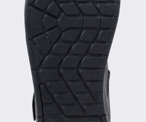 The tread pattern is designed for traction off the bike. Directionally angled and spaced toe and heel lugs offer traction for hiking up or down steep terrain. The ramped toe provides walkability on steep terrain.