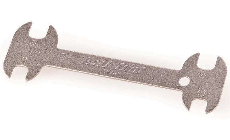 A thin offset wrench with 10, 11, 12 and 13mm openings made to fit and adjust many models of side pull and dual pivot brakes.