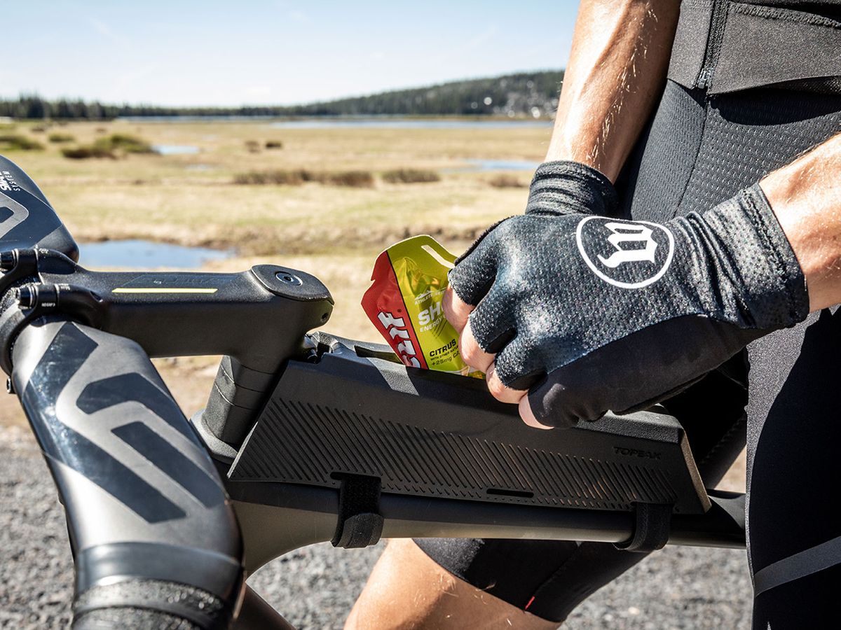An aerodynamic top tube fuel box design minimizes wind drag while eliminating interference with legs. Mounts by built-in top tube integrated bosses or secure scratch-free straps. The large opening provides quick and convenient access to energy bars, gels, or other energy items. Compatible with triathlon, time trial and road bikes.
