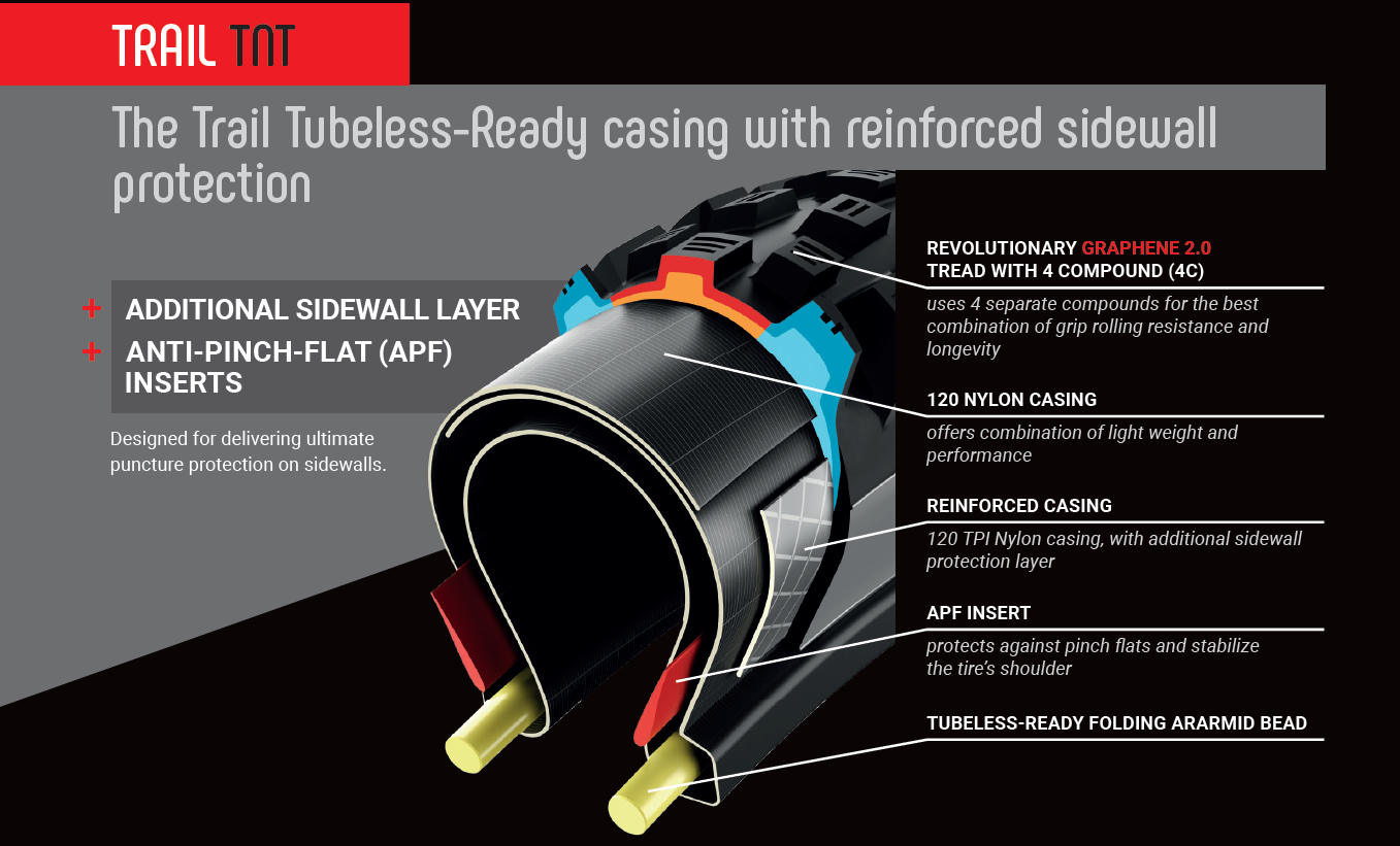 The e-Agarro Trail 4C’s tread blends four Graphene-infused compounds to minimize rolling resistance, maximize confident grip, and boost durability and battery life. The 120-TPI single-ply nylon Trail casing features a supple, lightweight, and abrasion-resistant single-ply construction that’s reinforced on the center strip and sidewalls.