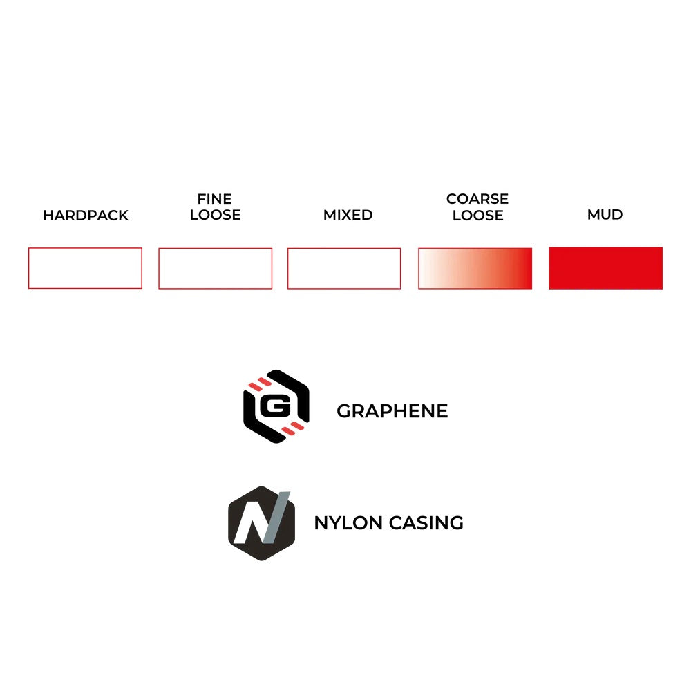The Graphene-infused compound is built-up into spacious, clog-cleaning tread with alternating center knobs that prevent digging a rut and pull you through loose terrain. The ultra-durable, supple Endurance nylon casing is reinforced with additional layers of puncture protection on the center strip and side walls.