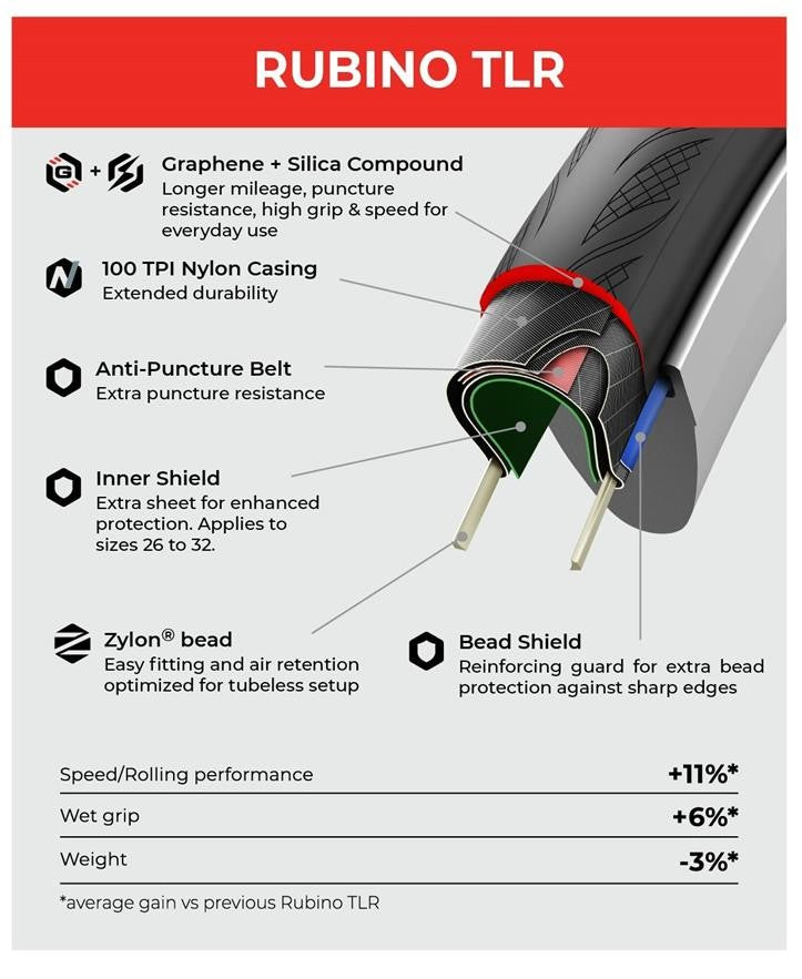The modernized Rubino tread increases speed, grip, and durability by utilizing a smooth center, which transitions smoothly into updated chevron clusters, while retaining the familiar grid texture at the limit. The new Graphene + Silica compound is engineered for long mileage, puncture resistance, high grip, and speed for everyday use.