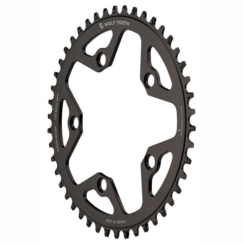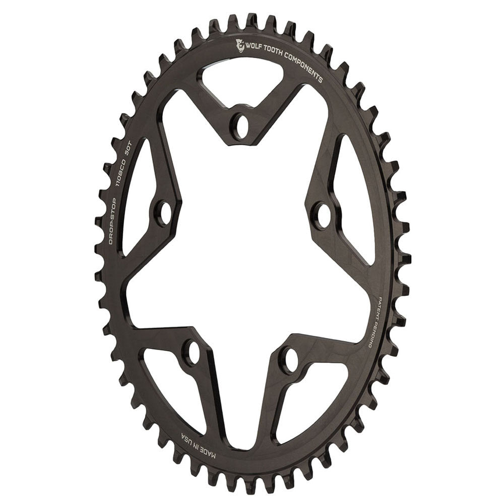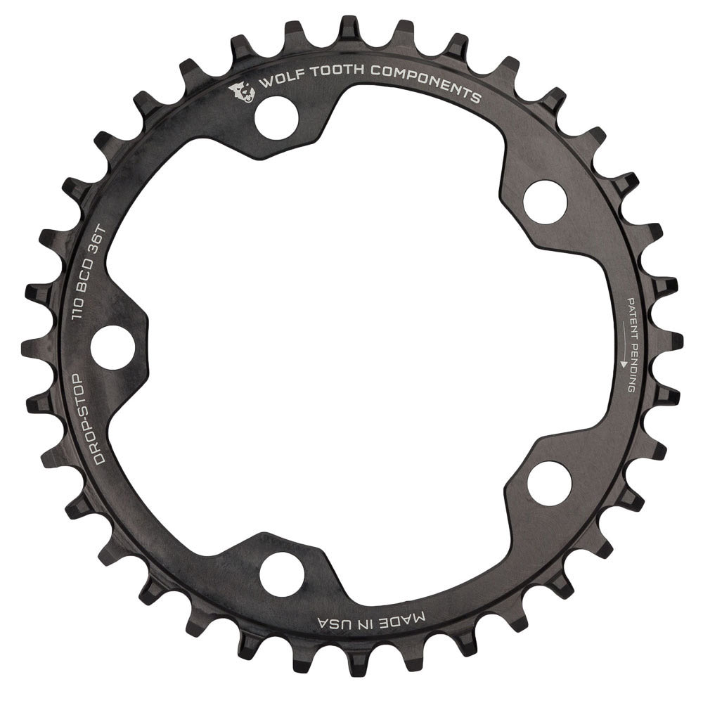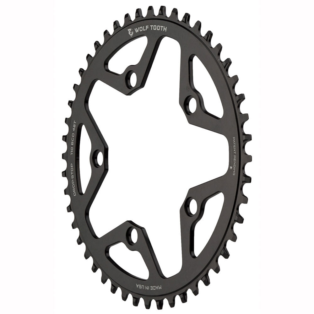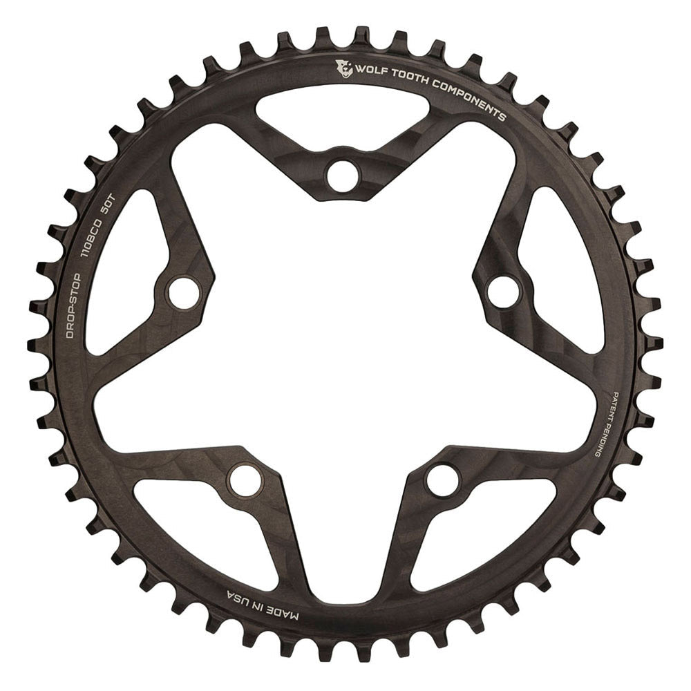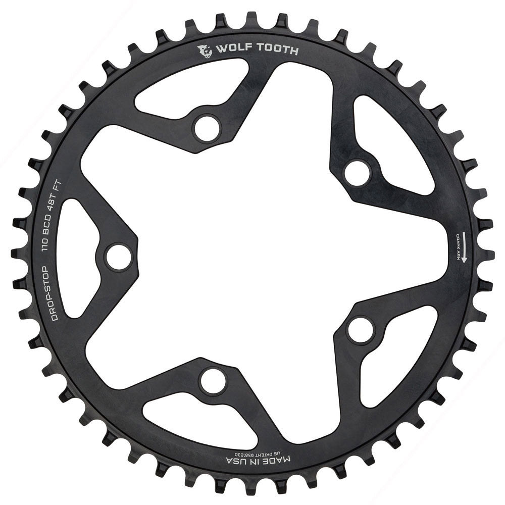 Drop-Stop technology: On Wolf Tooth’s patented wide/narrow chainring, the wide side of the tooth has maximum contact on the drive side which spreads the load and improves chainring life. The narrow side allows clearance for mud and debris which reduces friction.