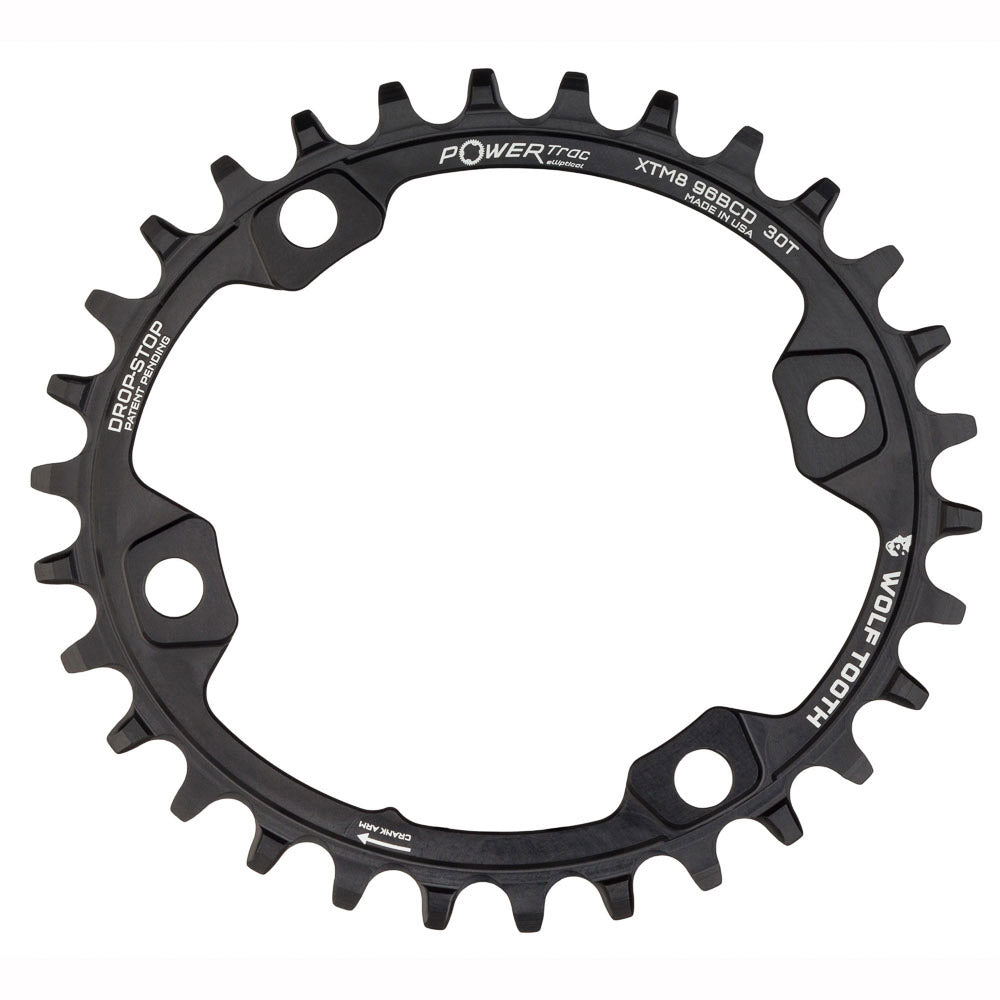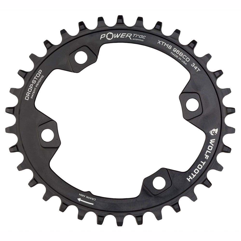 • Drop-Stop technology: On Wolf Tooth’s patented wide/narrow chainring, the wide side of the tooth has maximum contact on the drive side which spreads the load and improves chainring life. The narrow side allows clearance for mud and debris which reduces friction.