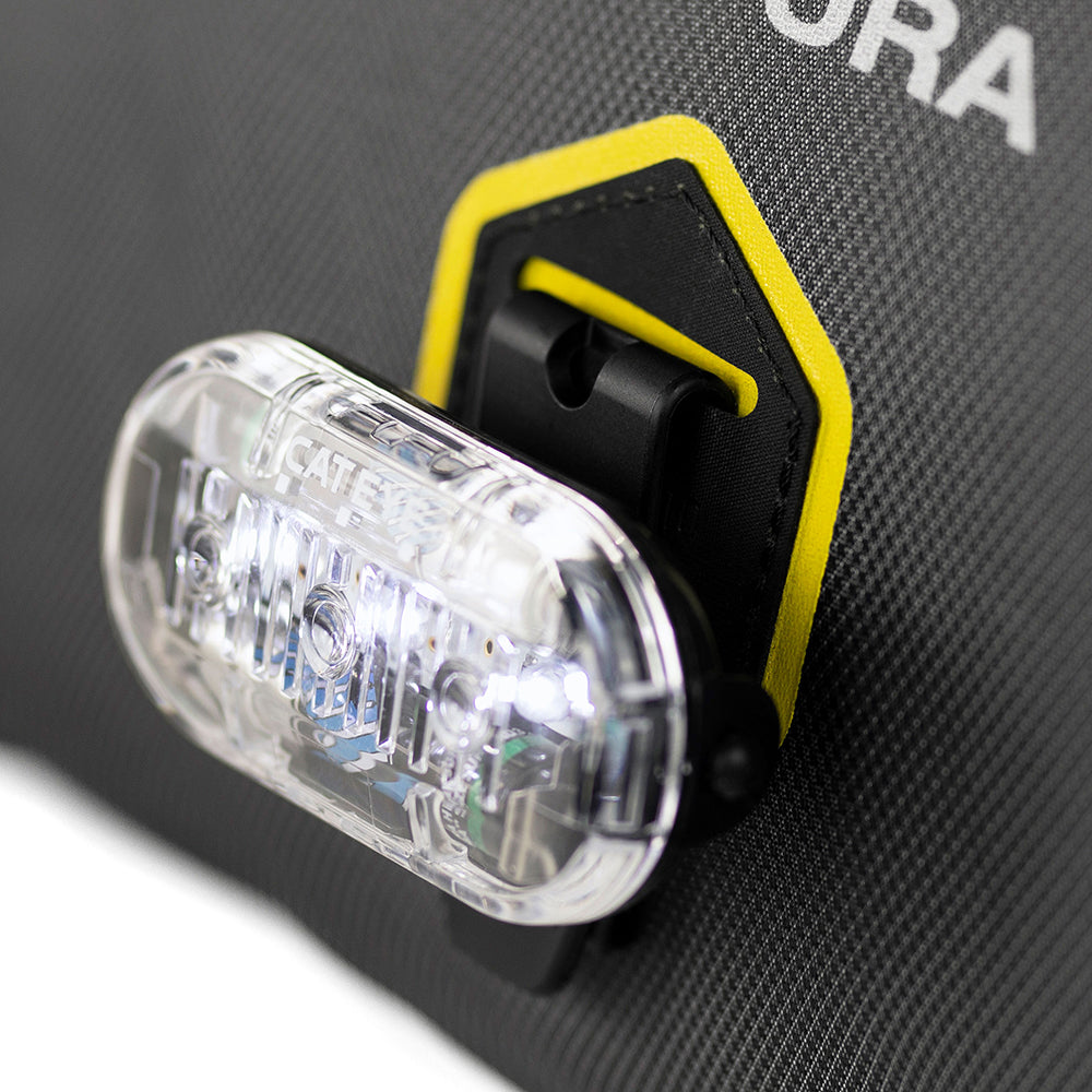 A light attachment point and reflective graphics have been added to the bag for added safety.