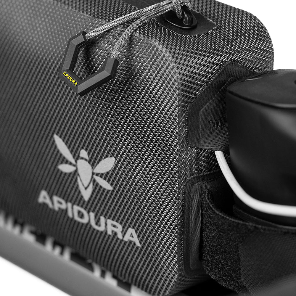 The Expedition Top Tube Pack is cut from a three-layer laminate fabric that was developed specifically for Apidura. The material is lightweight, and is highly resistant to tears and abrasion. Notably, it’s welded together at the seams, creating a watertight seal that ensures the top tube bag remains completely waterproof.