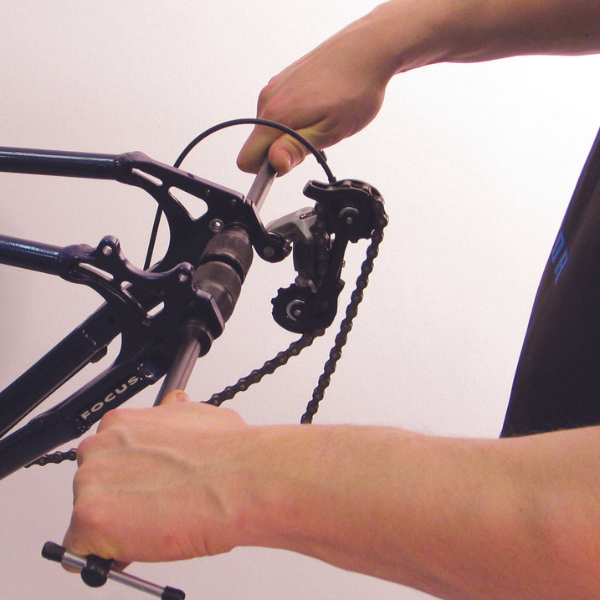 To use, remove the wheel and insert the tool into the frame. This tool is used for the alignment of the rear triangle and dropouts.