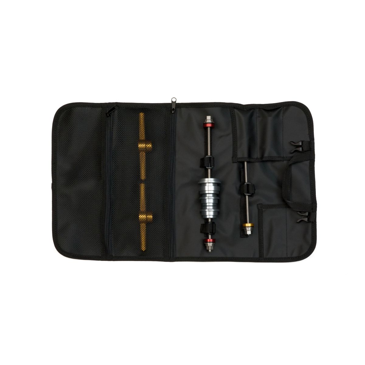 The Enduro bearings Multi Press is designed to service a variety of bearing applications and components all in one tool-set. The Multi Press will install headset cups, bottom bracket bearings, hub bearings, and linkage bearings. This toolset includes 3 different length rods in 2 different diameters. The larger diameter rod is tasked with installing headset cups, while the 2 smaller diameter rods handle bottom bracket, hub and suspension linkage bearings. The 2 smaller diameter rods are compatible with the BRT-005 hub press, BRT-002 and BRT-003 bottom bracket service tools. This compatiblity allows a customizable way to pack your toolbox for travel, taking only the components you need for lightweight packing. The Multi Press Alloy handles are removable, exposing 15mm stainless steel endnuts for tight clearences in linkage assemblies. Built into the stainless steel endnuts are delrin bearings for smooth operation while installing the bearings.