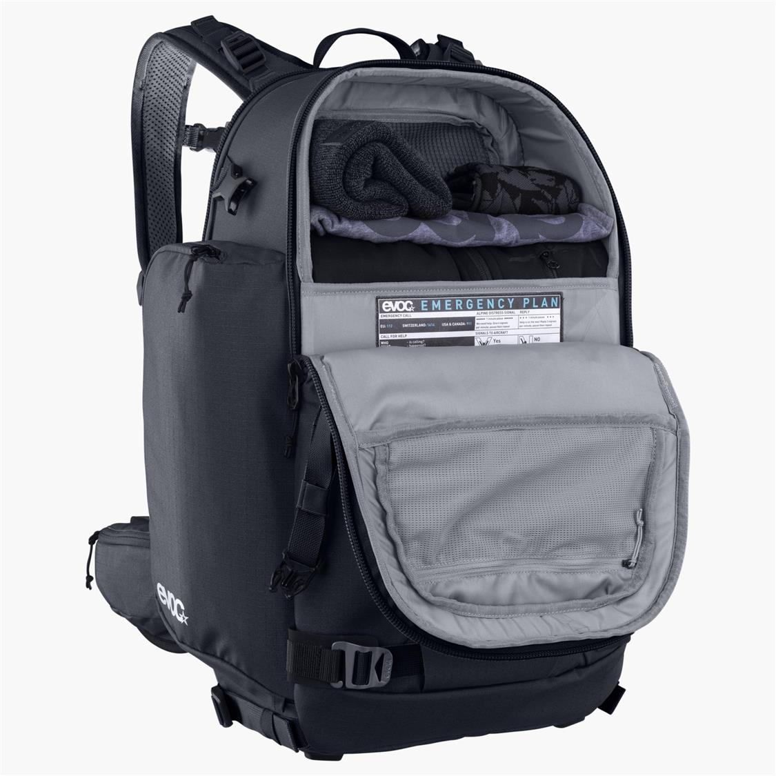 • Inside, a 60/40 PARTITION creates a padded, customizable camera sleeve and a sleeve for personal belongings. It can be opened from the back – or you can take out the camera via the quick access feature from the side. Skis, snowboards or tripods can be attached to the backpack via MULTIFUNCTIONAL LOOPS, and there’s room for a 2 litres hydration bladder at the side. There’s also a sleeve for avalanche equipment or a laptop.