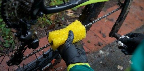 Grip the sponge firmly, rotate the pedals for 30 seconds to a minute allowing the chain to pass through the sponge which will remove the grime from the chain.