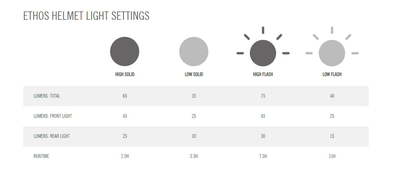 Choose to ride, choose to be seen. The Ethos™ Mips® is a revolution in transportation, with a compact and stylish form featuring the added protection of Mips® Brain Protection System highlighted by integrated LED front white lights, rear red lights, and amber turn signals, all controlled via an intuitive handlebar remote. The entire system is USB-C rechargeable with an estimated run time of 10 hours in low-blink mode and 5 hours in the high-blink mode, which delivers 45 lumens front and 30 lumens rear. Helmet and remote can be fully charged in just 2 hours and 1 hour, respectively. The Ethos Mips features a TPU soft rubber waterproof brim. (The Ethos Mips also is available with a clear, molded eye shield as the Ethos Mips Shield). Despite the added technology, in-mold construction keeps the weight manageable, full hardbody coverage adds durability, and a Roc Loc® City Mips fit system plus quick-dry padding ensure comfort. Whether you're a dedicated bike commuter, running the kids to school on your e-cargo bike, or simply looking for added visibility as you ride around town, the Ethos Mips is a look into the future.