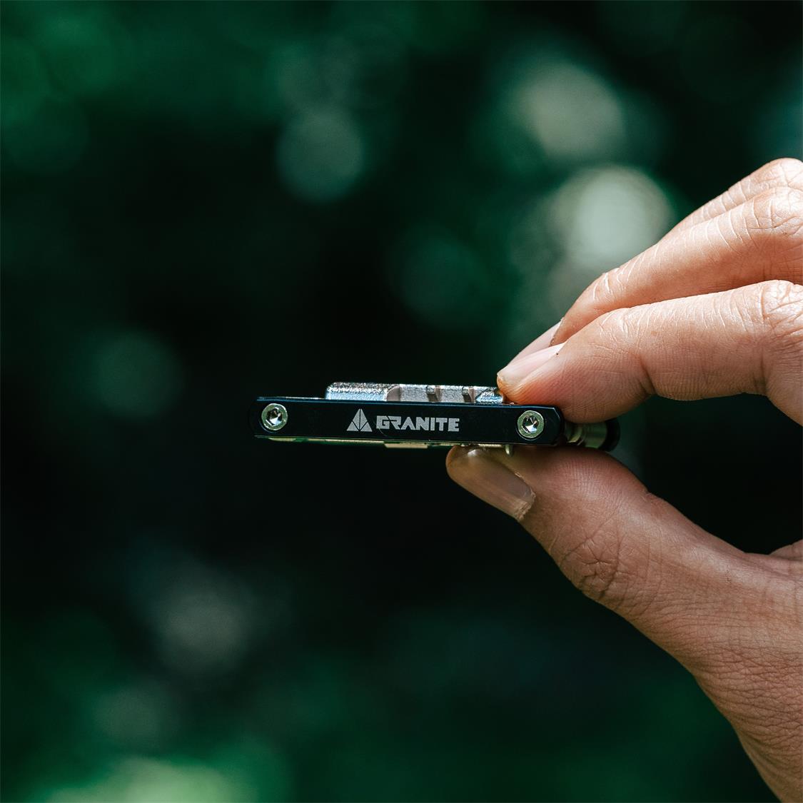 Granite Diverse 20 packs maximum functionality into an impressively slim form—just 11mm thick. Weighing only 104g, this ultra-compact multi-tool is built for riders who demand versatility without the bulk. With 20 essential functions—including hex bits (2 to 8mm), T25, PH2 screwdriver, chain tool and hook, spoke wrenches, socket wrenches, and even a bottle opener—it’s your all-in-one solution for trailside fixes and mid-ride adjustments.