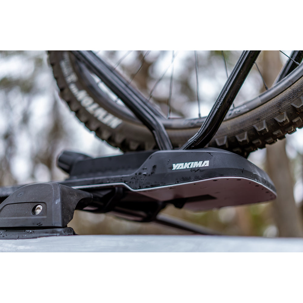 Secure, sleek, and simple to use, the HighRoad is Yakima's premium upright bike mount. The adjustment-free hoop, with its TorqueRight™ tightening knob, loads a variety of bikes quickly and easily. The HighRoad secures the bike by the wheels for ultimate bike protection and the low-profile design minimizes hatch interference. Universal mounting hardware fits most roof racks.