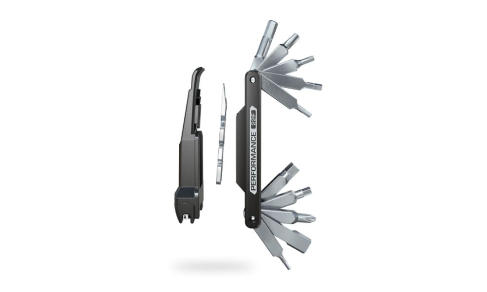 Upgrade and outperform your abilities to deal with mid-ride mechanicals with the PRO Mini Tool Performance 22 Function. It has, as the name suggests, 22 functions including all the Allen, Torx, screwdriver and spoke wrench keys you are likely to need when repairing a mid-ride mechanical. It also boasts a 12-speed compatible chain tool and an integrated tyre lever. All of this is combined in a compact, alloy mini tool which can be houses in a saddle bag, a storage bottle, or in the pocket of your riding jersey.
