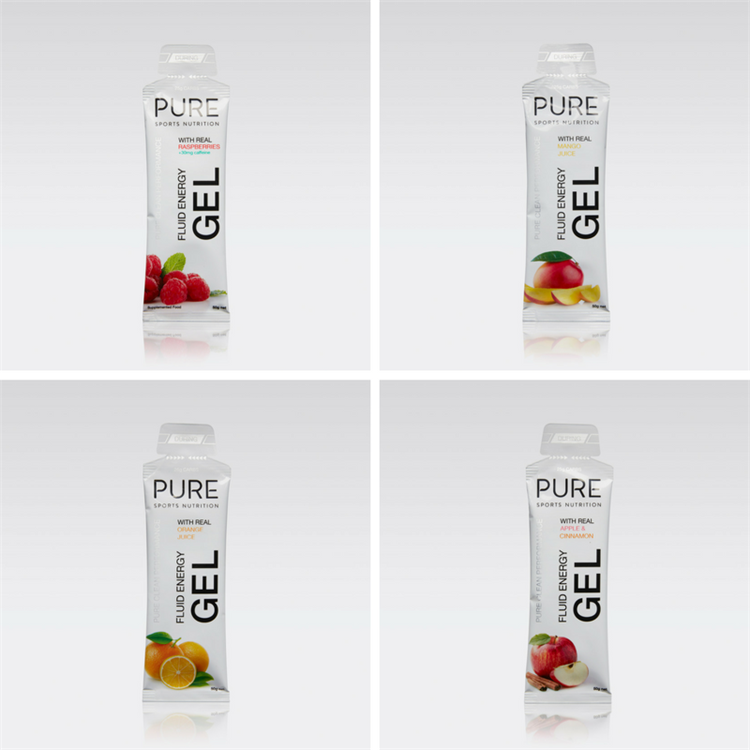PURE Fluid Energy Gels are flavoured with real fruit and fruit juices. The gel is not sickly sweet and is not thick like other gels on the market. This makes them easier to consume while exercising and racing.