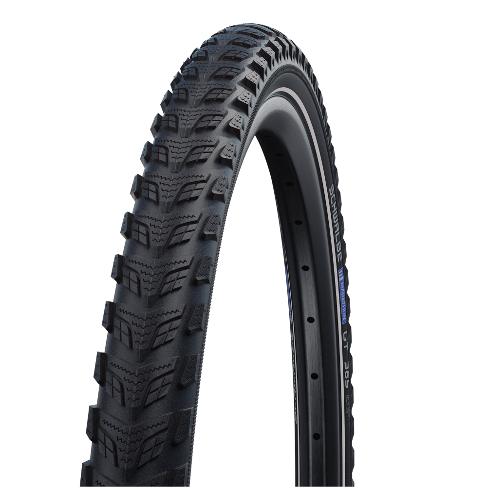 The original: The archetypal high quality touring tire. The highly elastic GreenGuard layer is 3 mm thick. One third of the GreenGuard is made up of recycled latex products. The “Anti-Aging” sidewall can withstand the typical cracking that results from overloading due to insufficient inflation pressure for much longer. E-Bike Ready. You can choose every Marathon for your E-Bike (E-25). The main sizes are approved and tested for E-bikes up to 50 km/h (E-50).