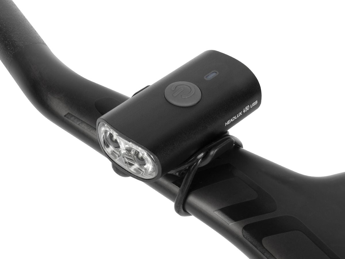 USB rechargeable, high-performance optical lens, low profile aluminum front light provides 450 lumens brightness with good value. Rubber strap provides bi-directional tool-free mounting and easy removal on aero / round handlebars or helmet.