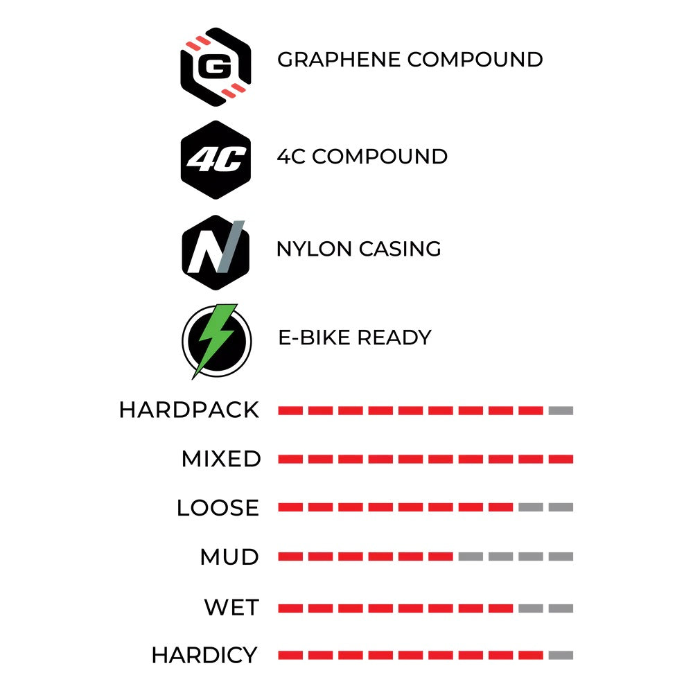 e-Martello hammers home the performance you expect, while extending your ride! Looking for the one tyre to tackle a wide range of courses? This is the ticket. How does the Martello deliver this level of performance? Start with 4C Graphene compound, and top it off with a moto-inspired tread design with progressive width siping. This last part is key, and provides for a progressive feel on the effective edge, allowing for that fine-touch tactile feel that top racers expect. Whether shredding rocks, roots, or mixed terrain, e-Martello delivers!
