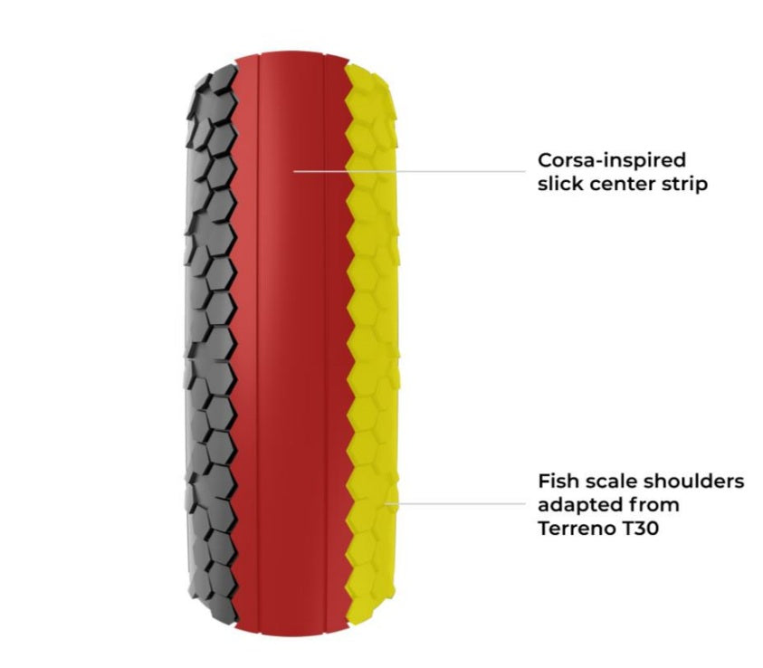 Corsa inspired tread design, for paved surfaces and hard-packed gravel. The smooth center rolls fast, while the side tread “scales” provide durable bite when cornering and braking.